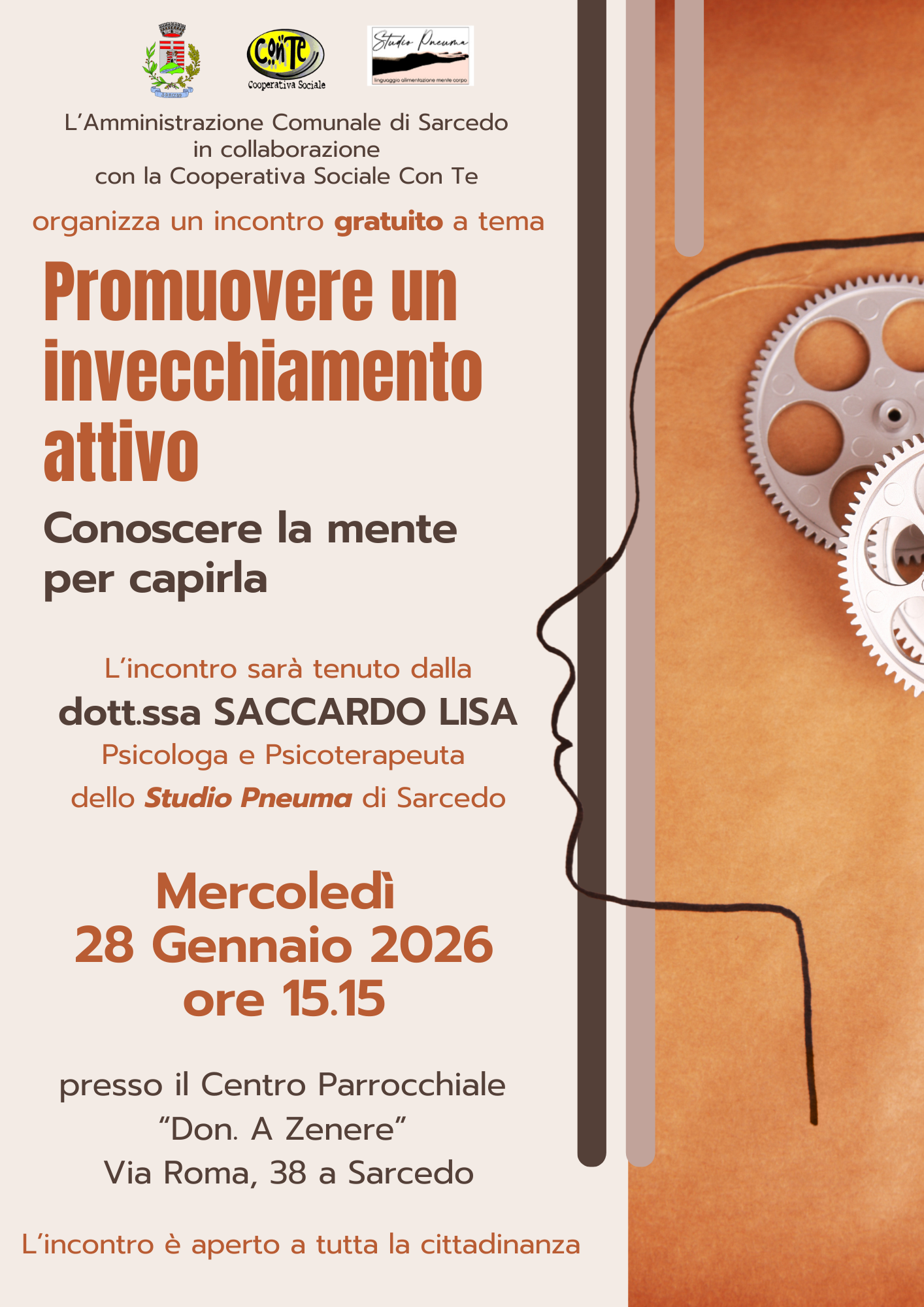 DESCRIPTION:NUOVO INCONTRO A GENNAIO CON IL GRUPPO ETA' SERENA A SARCEDO\N Invecchiare non significa "fermarsi": al contrario, può essere una fase della vita ricca di opportunità, stimoli e nuove scoperte. Per esplorare come mantenere mente e corpo in salute, il Comune di Sarcedo invita tutta la cittadinanza a un appuntamento speciale dedicato al benessere.\NL’incontro si terrà mercoledì 28 gennaio 2026 e vedrà come relatrice la Dott.ssa Lisa Saccardo, psicologa e psicoterapeuta dello Studio Pneuma, che ci guiderà alla scoperta delle migliori strategie per promuovere un invecchiamento attivo e consapevole.\NL’incontro è GRATUITO e APERTO a tutti gli interessati. Vi aspettiamo per un pomeriggio di condivisione, curiosità e nuove scoperte!\N \N\N