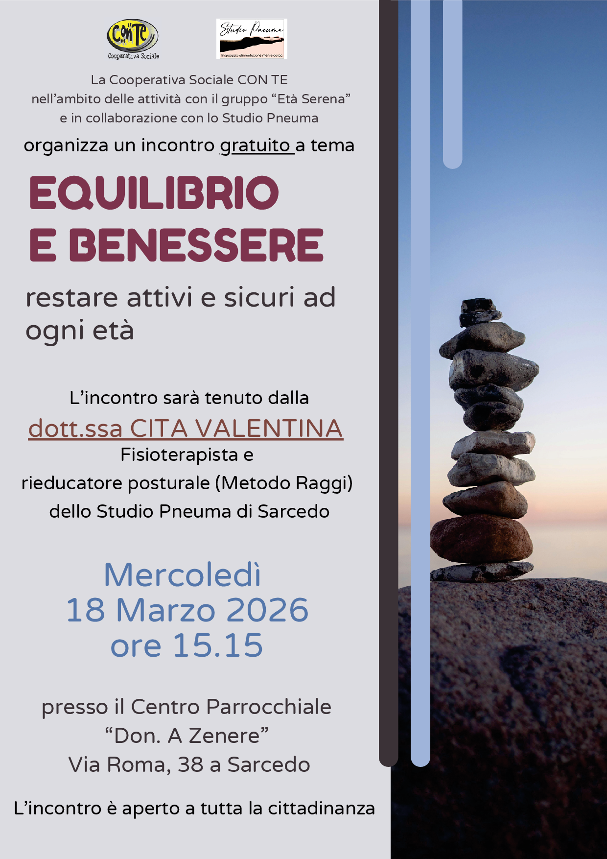 DESCRIPTION:"Il benessere passa attraverso la consapevolezza del proprio corpo. Imparare a muoversi correttamente è il primo passo per restare indipendenti e in salute."\NDopo il successo dei primi incontri dedicati alla salute, la rassegna informativa di Sarcedo prosegue con un appuntamento imperdibile dedicato alla fisicità e alla prevenzione. \NIl tema centrale sarà la gestione del proprio corpo per mantenere autonomia e vitalità nel tempo.\NL’incontro, dal titolo "Equilibrio e benessere, restare attivi e sicuri ad ogni età", si terrà mercoledì 18 marzo 2026 presso il Centro Parrocchiale "Don A. Zenere".\NA guidare l'incontro, la dott.ssa VALENTINA CITA, fisioterapista e rieducatore posturale dello Studio Pneuma di Sarcedo. Grazie alla sua esperienza professionale, i partecipanti potranno approfondire come la postura e l'equilibrio siano i pilastri fondamentali per evitare cadute e infortuni: migliorando la qualità della vita. \NL’incontro è GRATUITO e APERTO a tutti gli interessati. Vi aspettiamo!\N \N